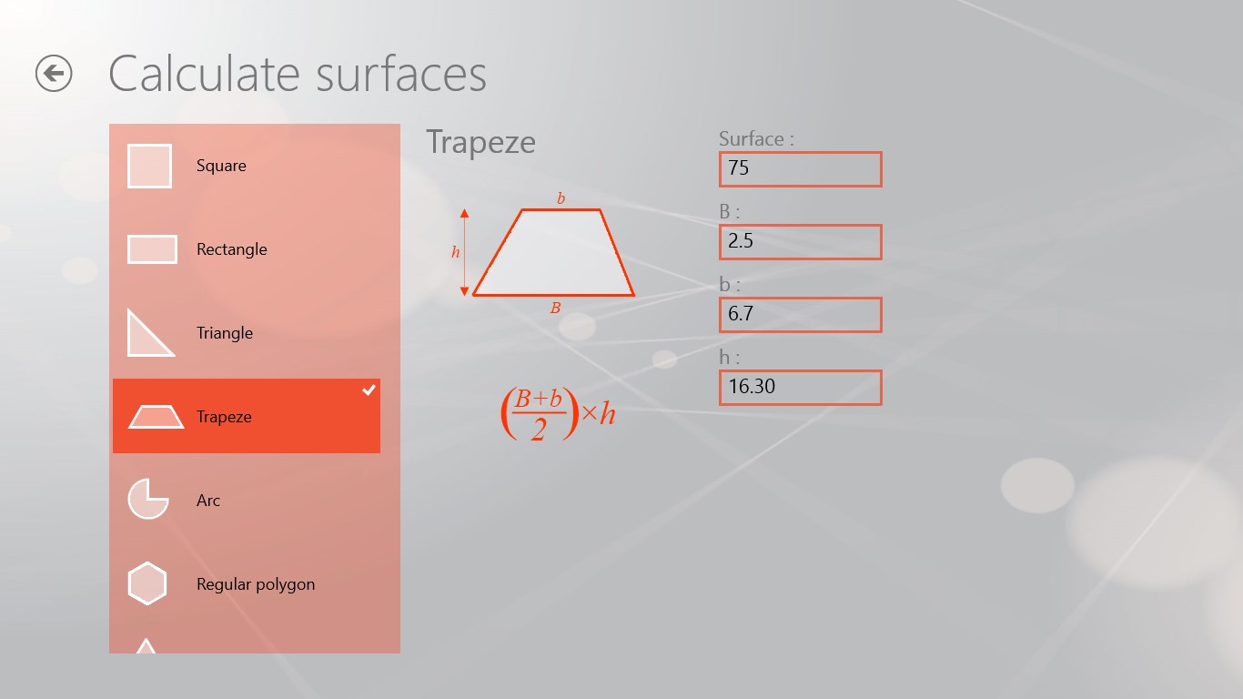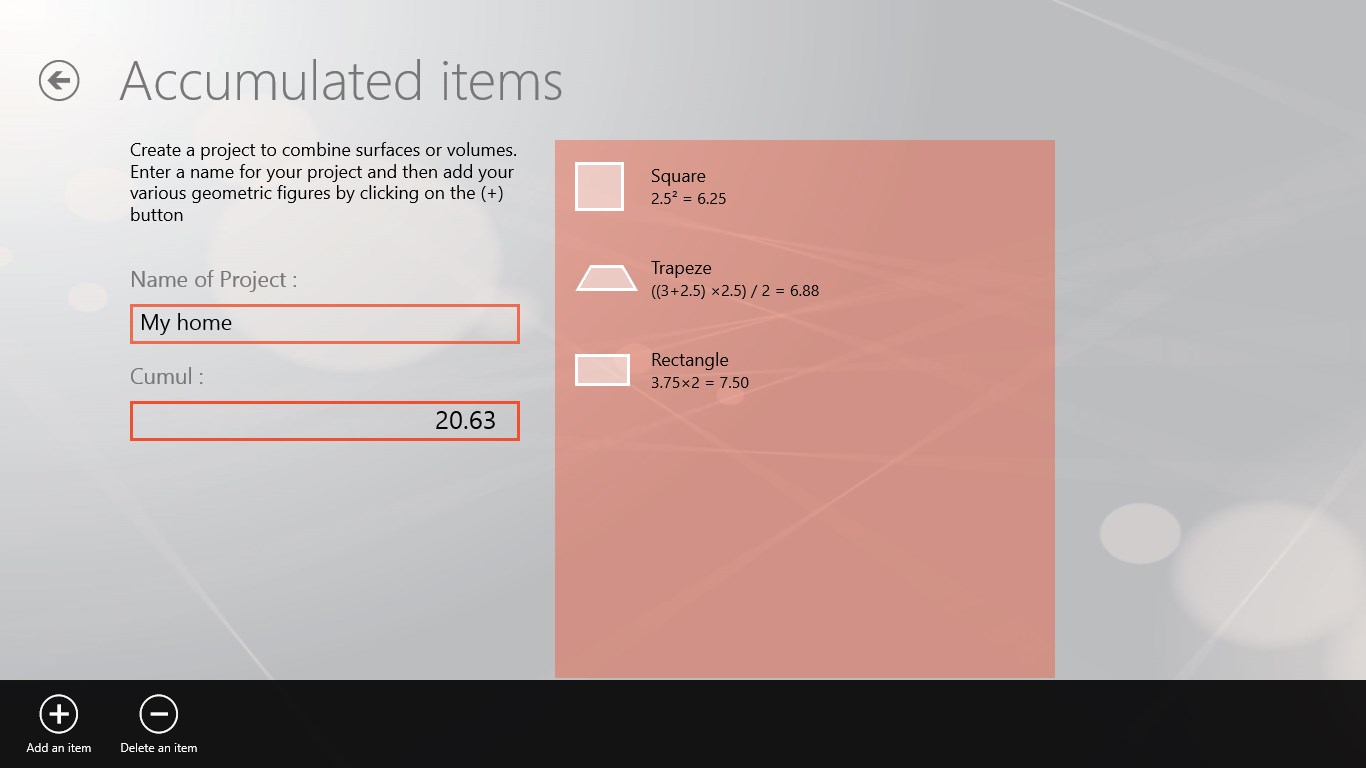 This application allows you to make calculations of surfaces and volumes by the addition of simple figures. It also