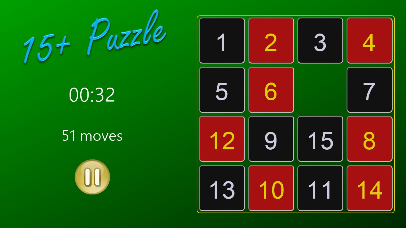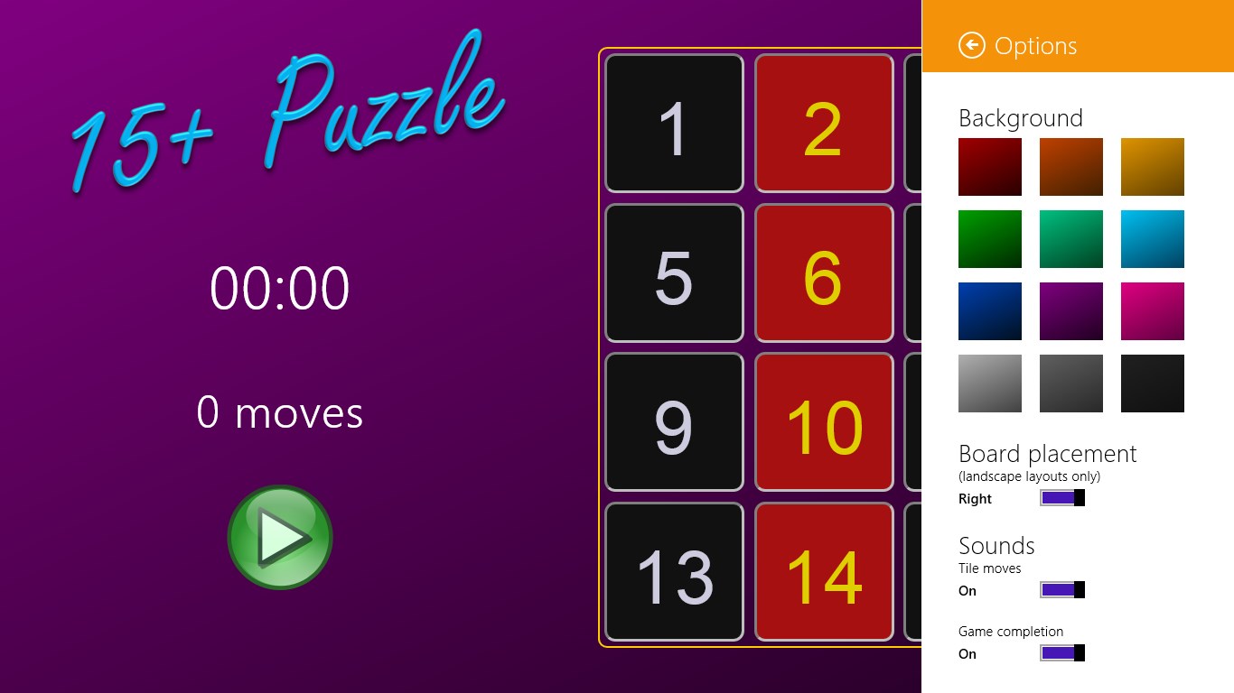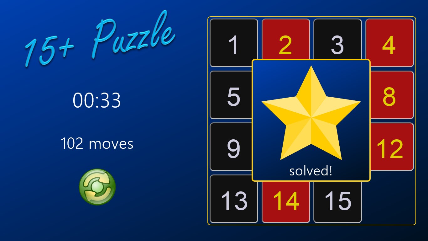 How fast can you arrange the tiles in order? 15+Puzzle lets you test your skill on 3x3, 4x4, and 5x5 grids. With fast, clean graphics, simple sounds, and configurable background colors, 15+Puzzle is ready for hours of enjoyment!
