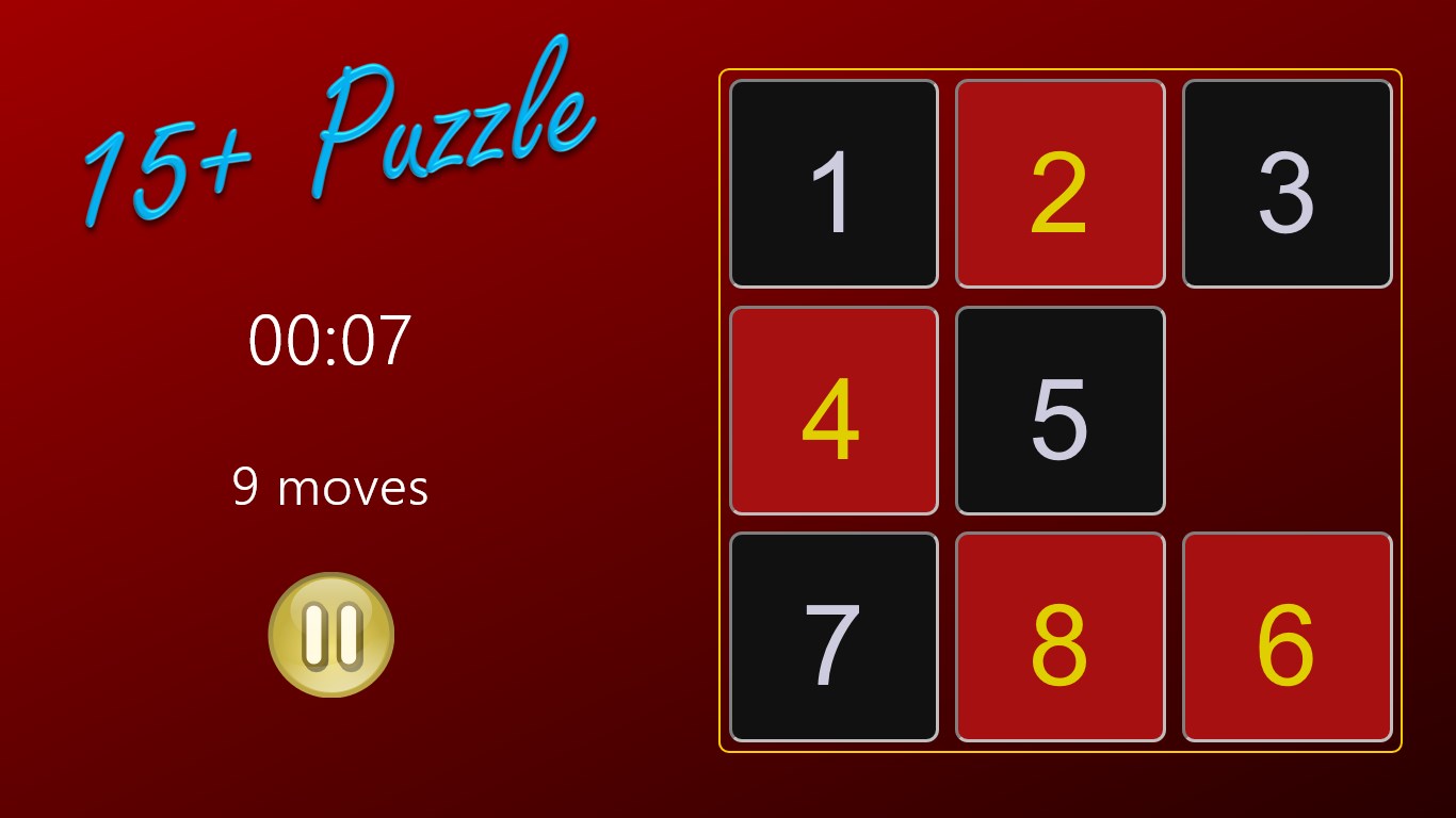 Clean graphics3x3, 4x4, and 5x5 grid optionsFull support for touch, mouse, and keyboard inputStars for fast timesBest scores page with times and movesOverall and per-grid statisticsSwappable left/right layoutSupport for portrait and narrow viewsConfigurable background colorsRoaming settings save your games and preferencesSoundHelp