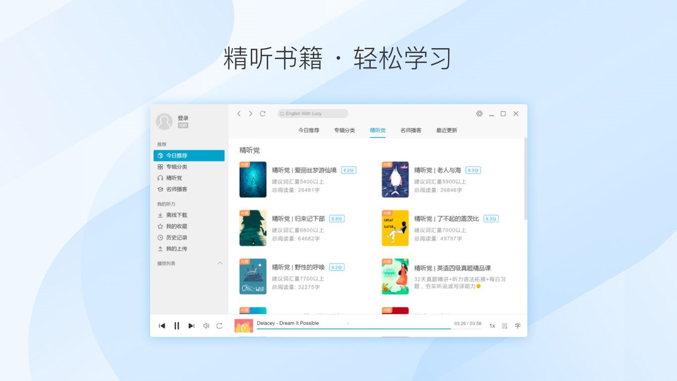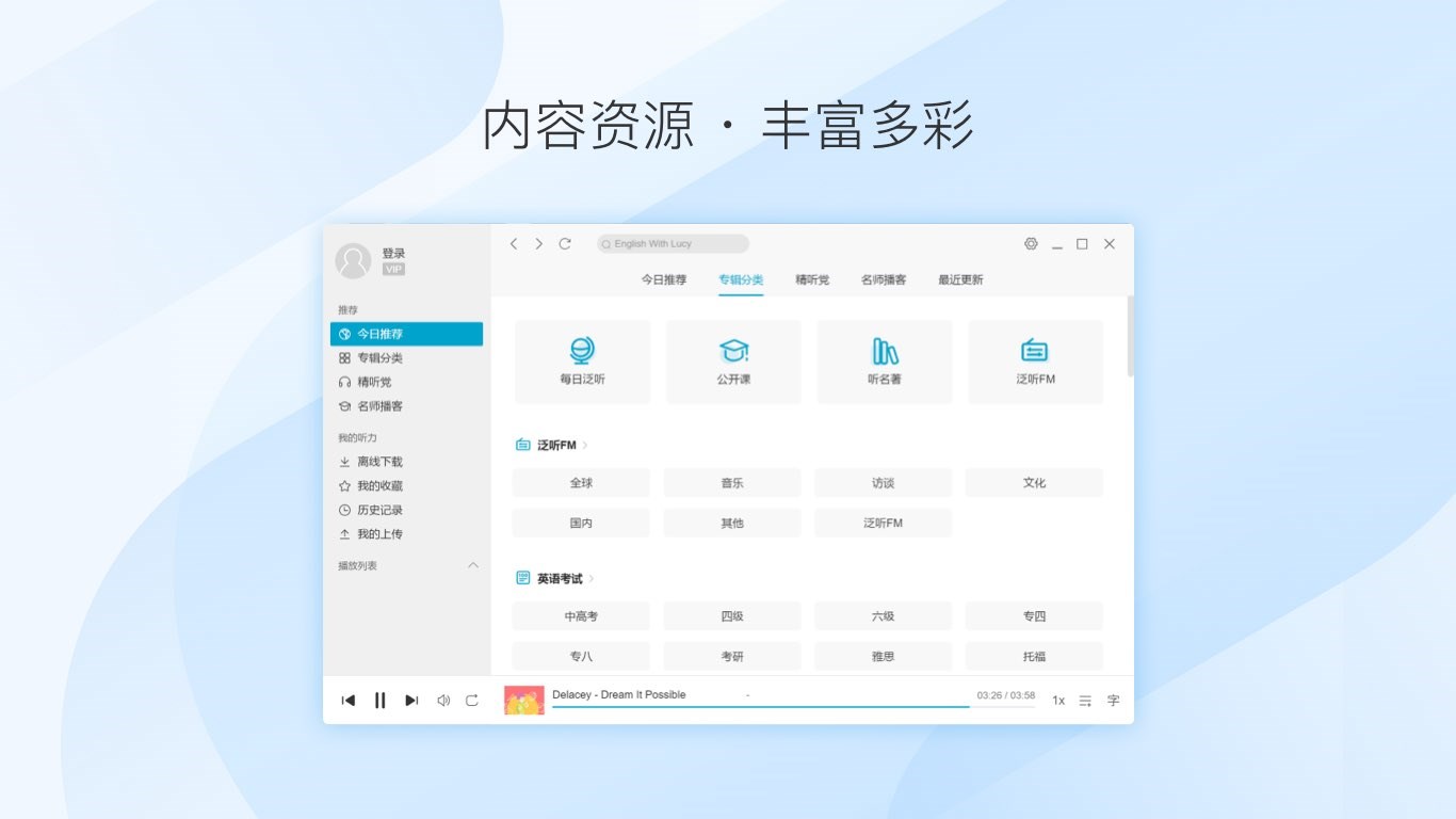 【海量听力】每天更新的听力资源库,中高考、四六级、CNN资源一站式收听【泛听FM】实时流畅收听BBC、VOA等节目,锻炼英语听力必备【听力练习】8档语速调节、4种循环模式,支持听写、测验练习,满足不同阶段的学习需求【词汇提示】智能提示文章中的生词难词,训练听力的同时轻松提高词汇量【批星管理】支持全部播放、一键下载,离线时也能随时练听力【简约设计】清晰简洁的界面设计,鼠标点划间畅享舒适的学习体验
