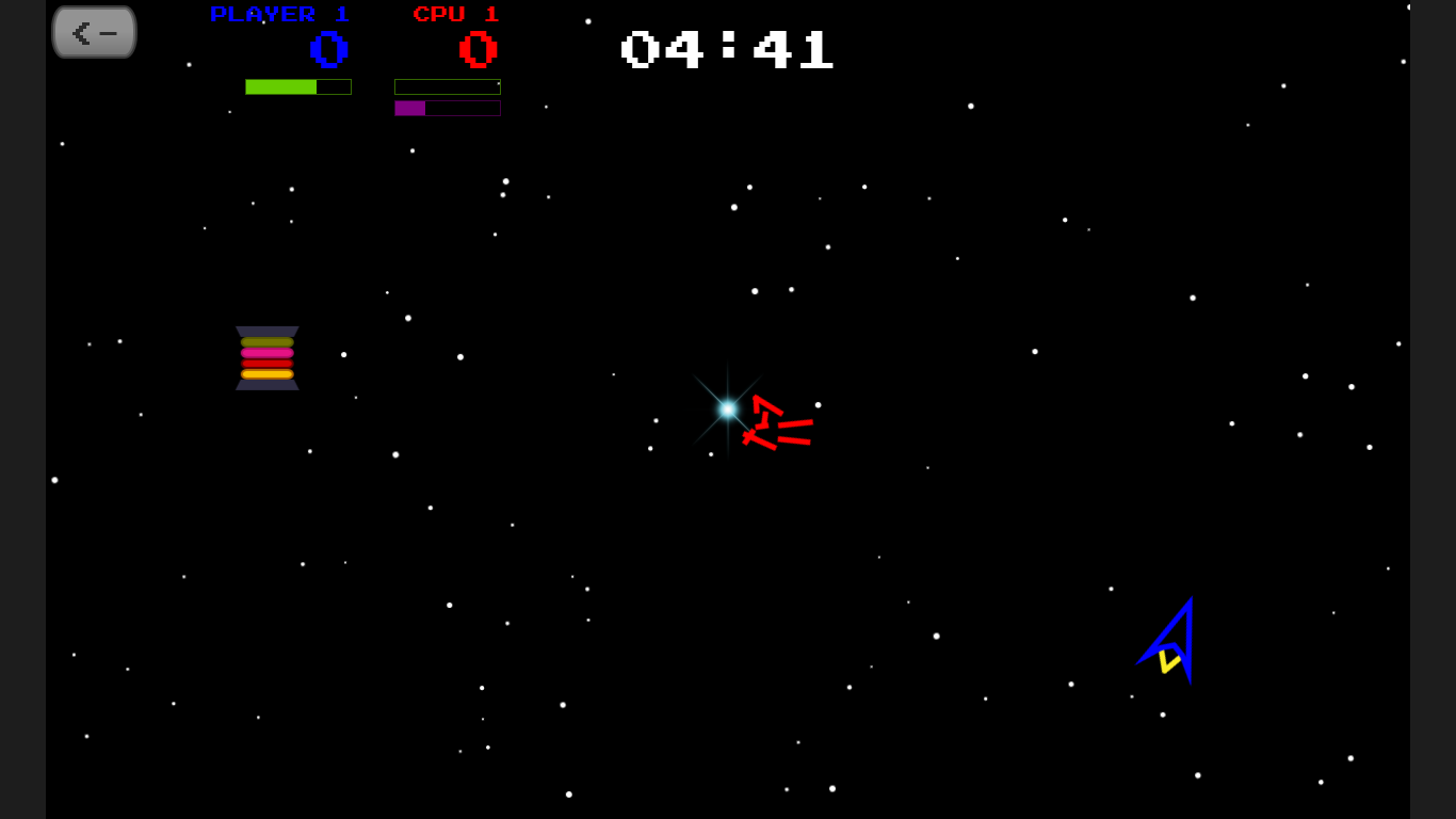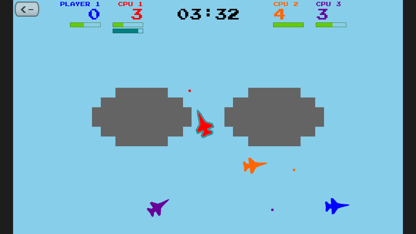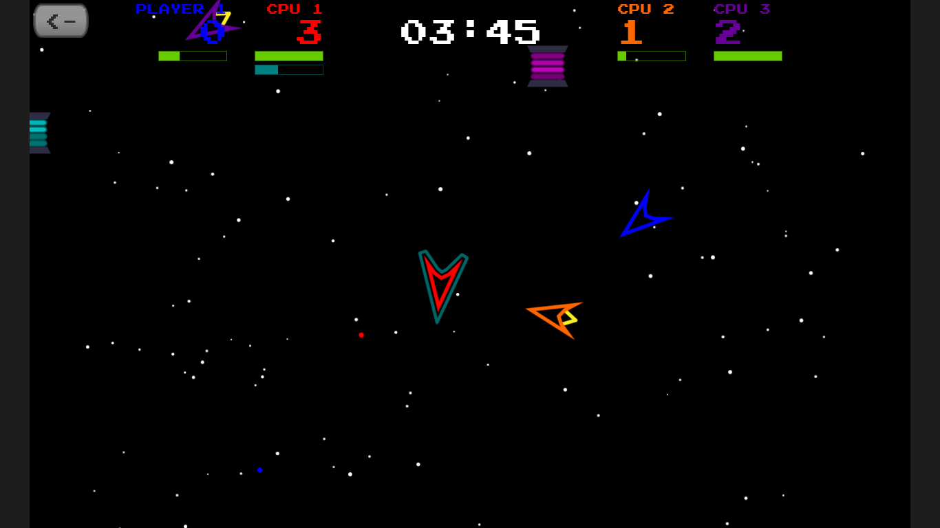 Includes multiple levels for tanks, jets and space ships.Power-ups make things more interesting. Some power-ups are great, and some...not so much!Each type of vehicle presents different challenges to control and master.Supports 1-4 players. Add computer-controlled players to make it even more fun.See if you can beat the computer controlled AI. Can you beat 3 of them at the same time?You choose how long a level lasts.Control your player with the keyboard, on-screen controls (for touch monitors) or game pads (such as Xbox controllers).Flying in space is hard. Flying with gravity pulling you to your doom is even harder.