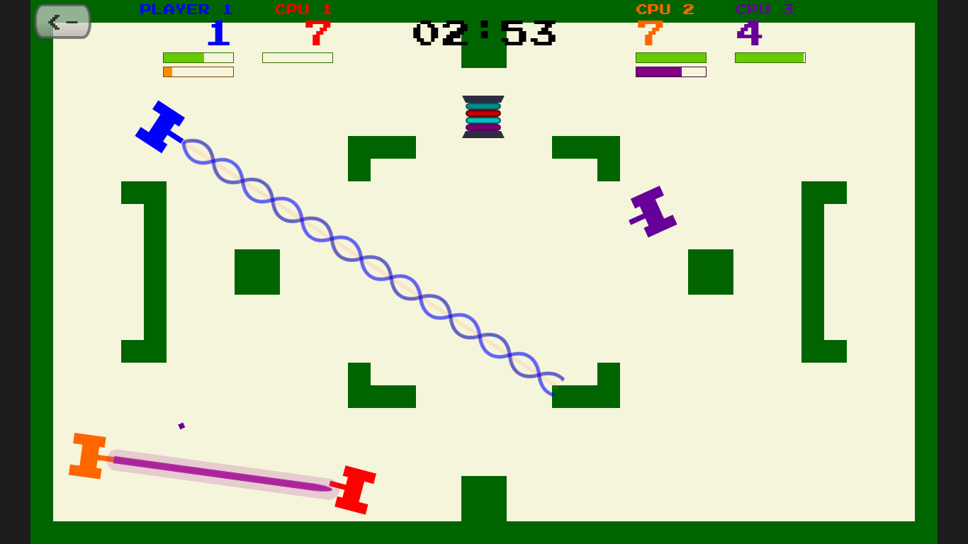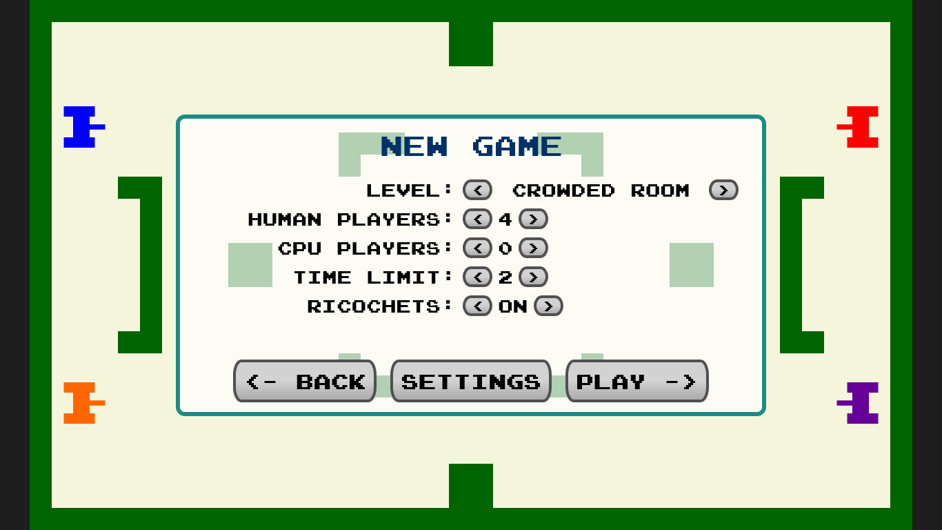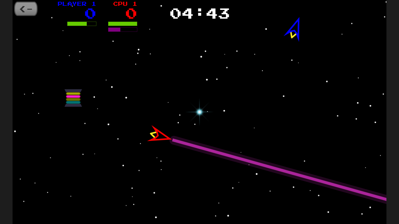 Includes multiple levels for tanks, jets and space ships.Power-ups make things more interesting. Some power-ups are great, and some...not so much!Each type of vehicle presents different challenges to control and master.Supports 1-4 players. Add computer-controlled players to make it even more fun.See if you can beat the computer controlled AI. Can you beat 3 of them at the same time?You choose how long a level lasts.Control your player with the keyboard, on-screen controls (for touch monitors) or game pads (such as Xbox controllers).Flying in space is hard. Flying with gravity pulling you to your doom is even harder.