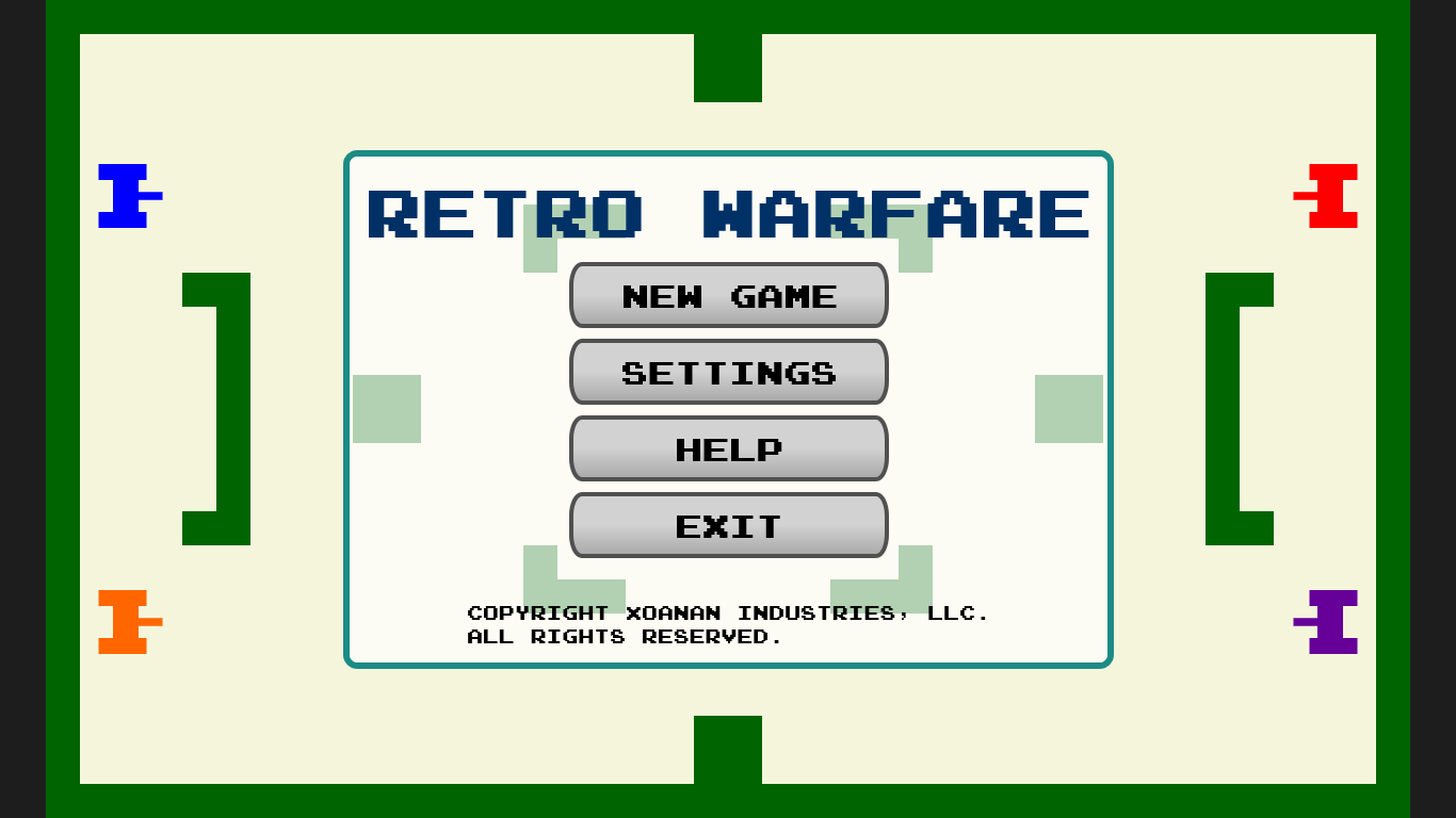 Retro Warfare is an action arcade game similar to Atari's 1977 game "Combat", with some additional modern twists. Different levels allow you to play as a tank, jet or space ship. Retro Warfare allows for 1 to 4 players, with any combination of players controlled by humans or the computer. (For 3 or 4 players, game controllers, such as Xbox controllers, are required.)