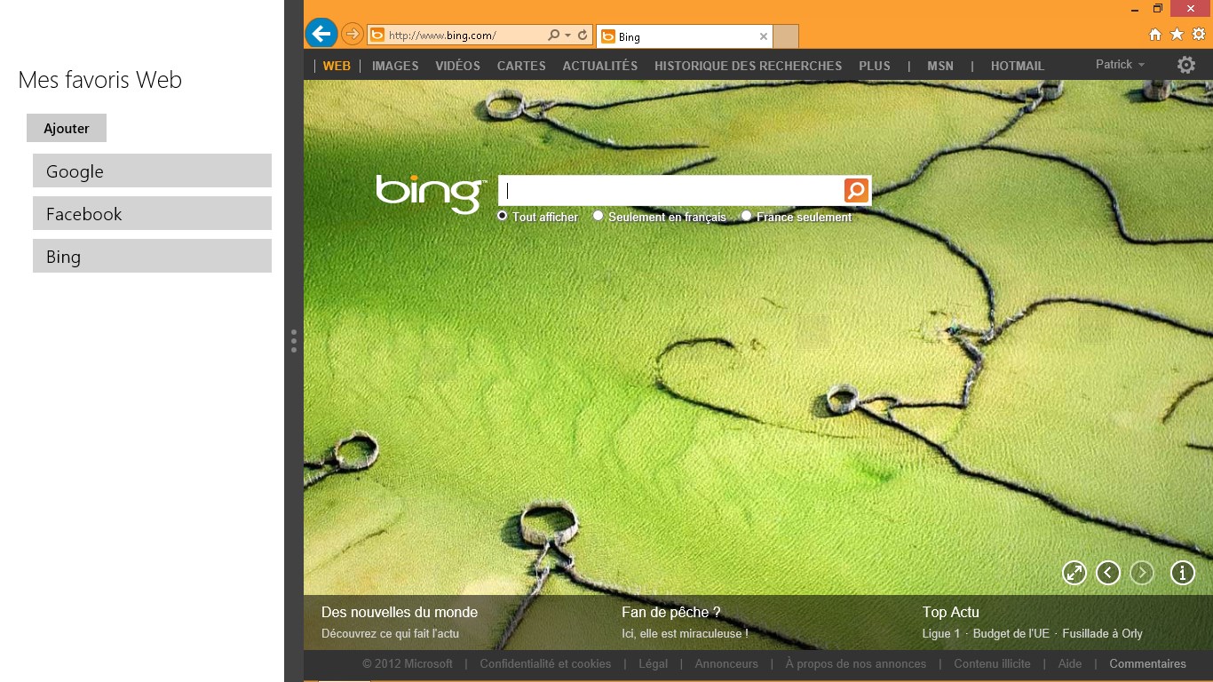 En plaçant l'application en vue "Snap", vous aurez la possibilité d'avoir une vue de votre navigateur, et de vos favoris.