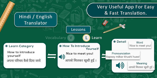 Hindi English Translator در بالای لیست قرار دارد آموزش دسته بندی برنامه ها در گوگل پلی استور امتیاز و نقدهای واقعاً خوبی دریافت کرده است. در حال حاضر, Hindi English Translator برای ویندوز گذشت 5,000,000 برنامه تاسیسات and 0 ستاره میانگین امتیازات مجموع کاربران.