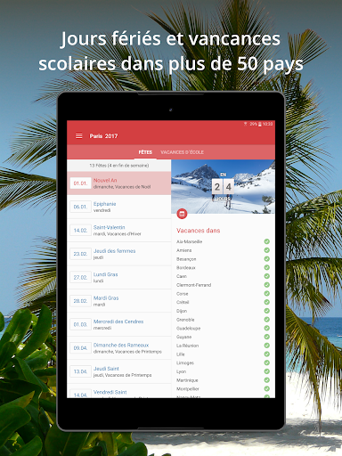 Fêtes et Vacances est en haut de la liste des Productivité applications de catégorie sur Google Playstore. Il a de très bonnes notes et critiques. Actuellement, Fêtes et Vacances Pour les fenêtres a dépassé 500 000 Application installations and 4.2 Star points d'évaluation globaux des utilisateurs moyens.