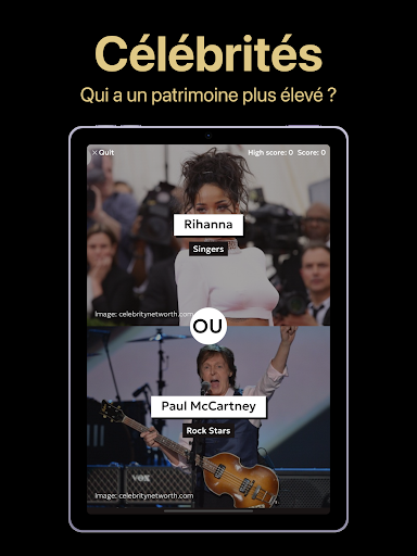 The Higher or Lower Game est en haut de la liste des Culture générale applications de catégorie sur Google Playstore. Il a de très bonnes notes et critiques. Actuellement, The Higher or Lower Game Pour les fenêtres a dépassé 50 000 Jeu installations and 3.9 Star points d'évaluation globaux des utilisateurs moyens.